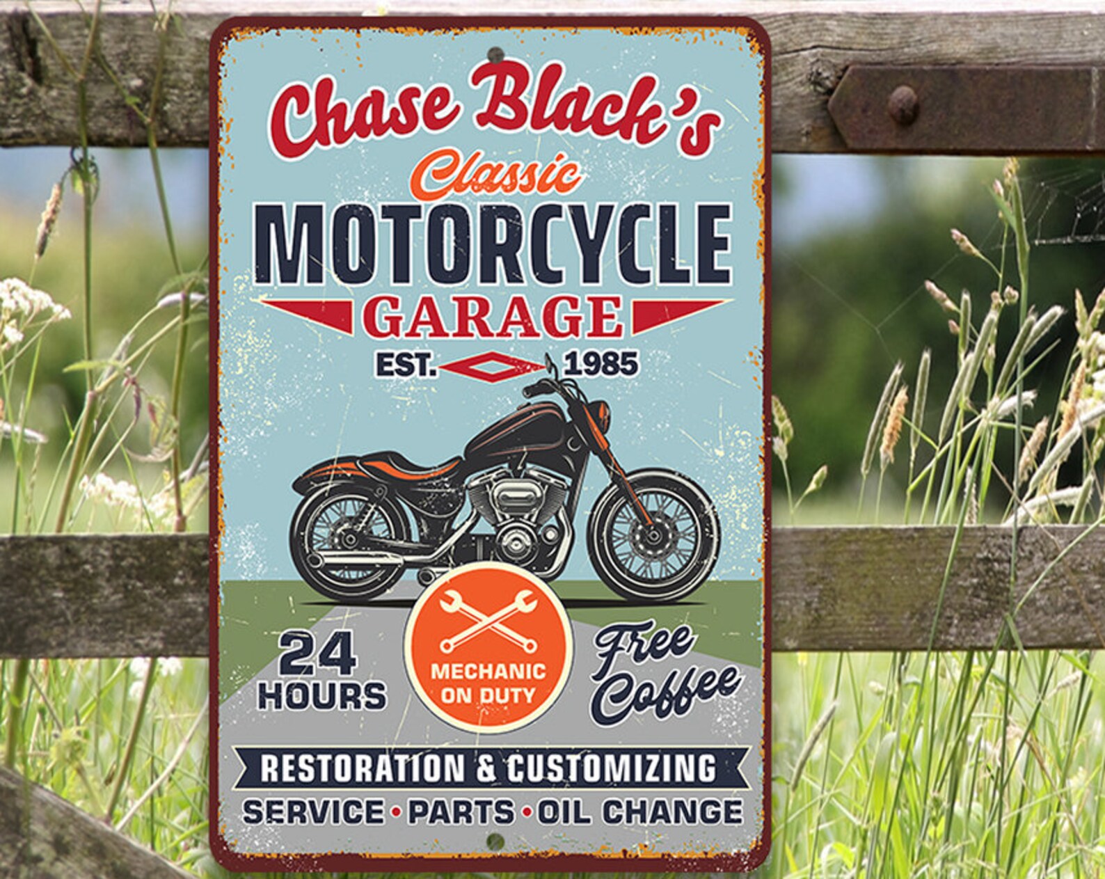 Be the first to review “Personalized Motorcycle Repair Garage Metal Sign – 8×12 or 12×18”