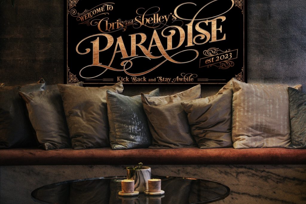 This Paradise Family Name sign offers a modern farmhouse look and feel. Display this vintage, wood paradise sign anywhere in your home or on the porch. It comes in your choice of metal or canvas!