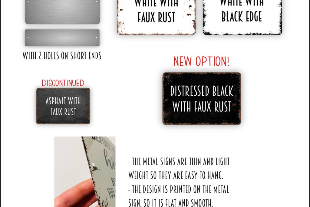 NOTE: All rustic add-ons including any rust, distressed marks, etc. are printed on and not real, so the signs are smooth to the touch.