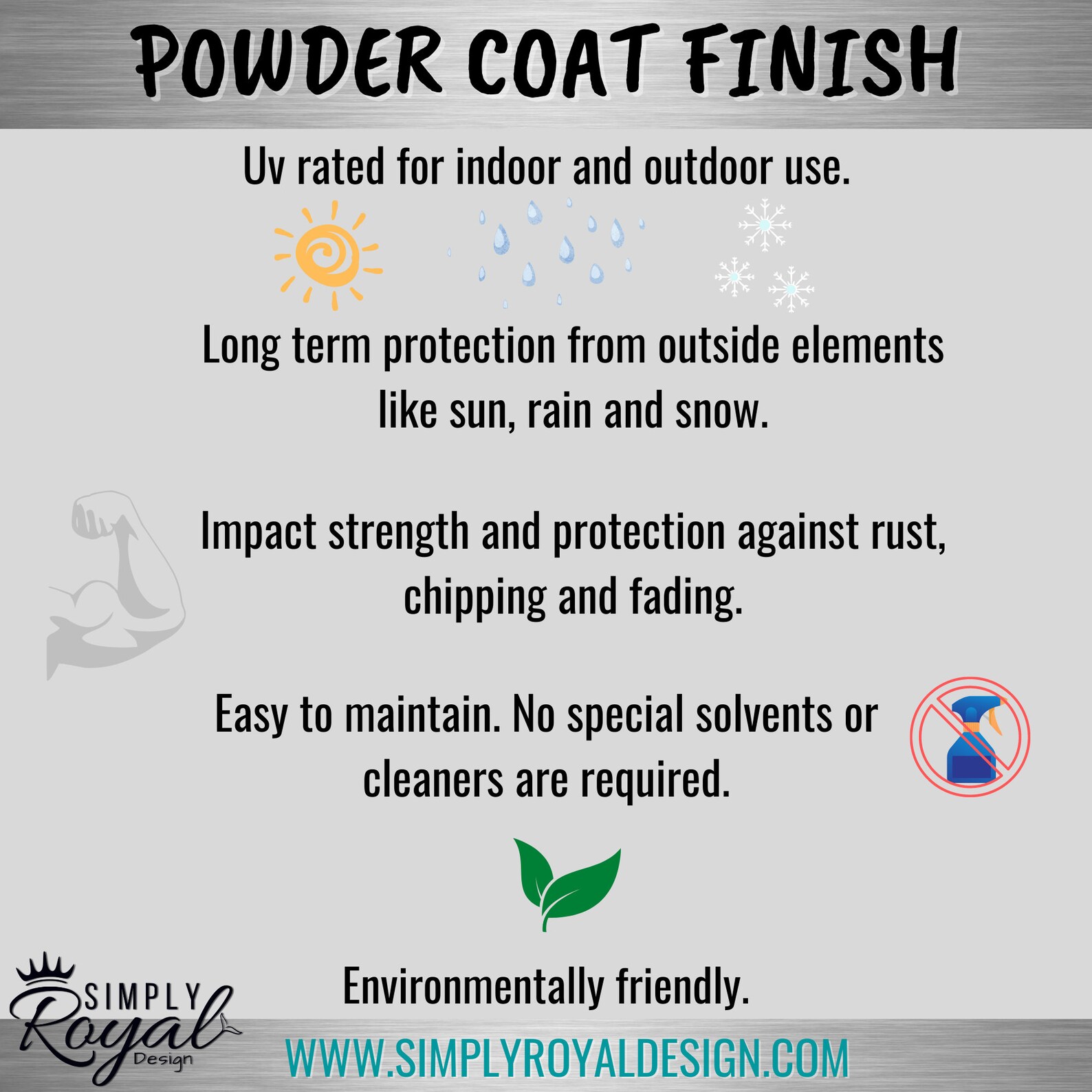 We use top quality materials and our powder coat is rated for both indoor and outdoor use. No maintenance required !