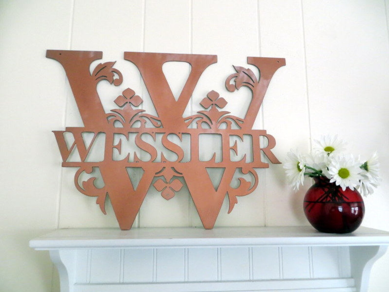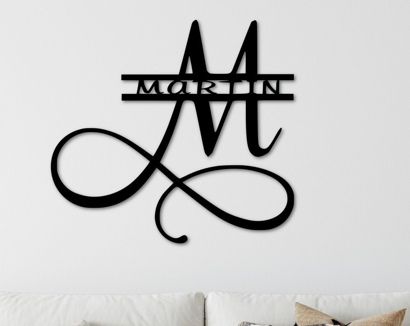 This sign is personalized with your family initial and has your family name running through the middle. This monogram is custom made with a CNC plasma cutter out of 14 gauge steel and measures approximately 12" tall, 20 tall or 30" tall.