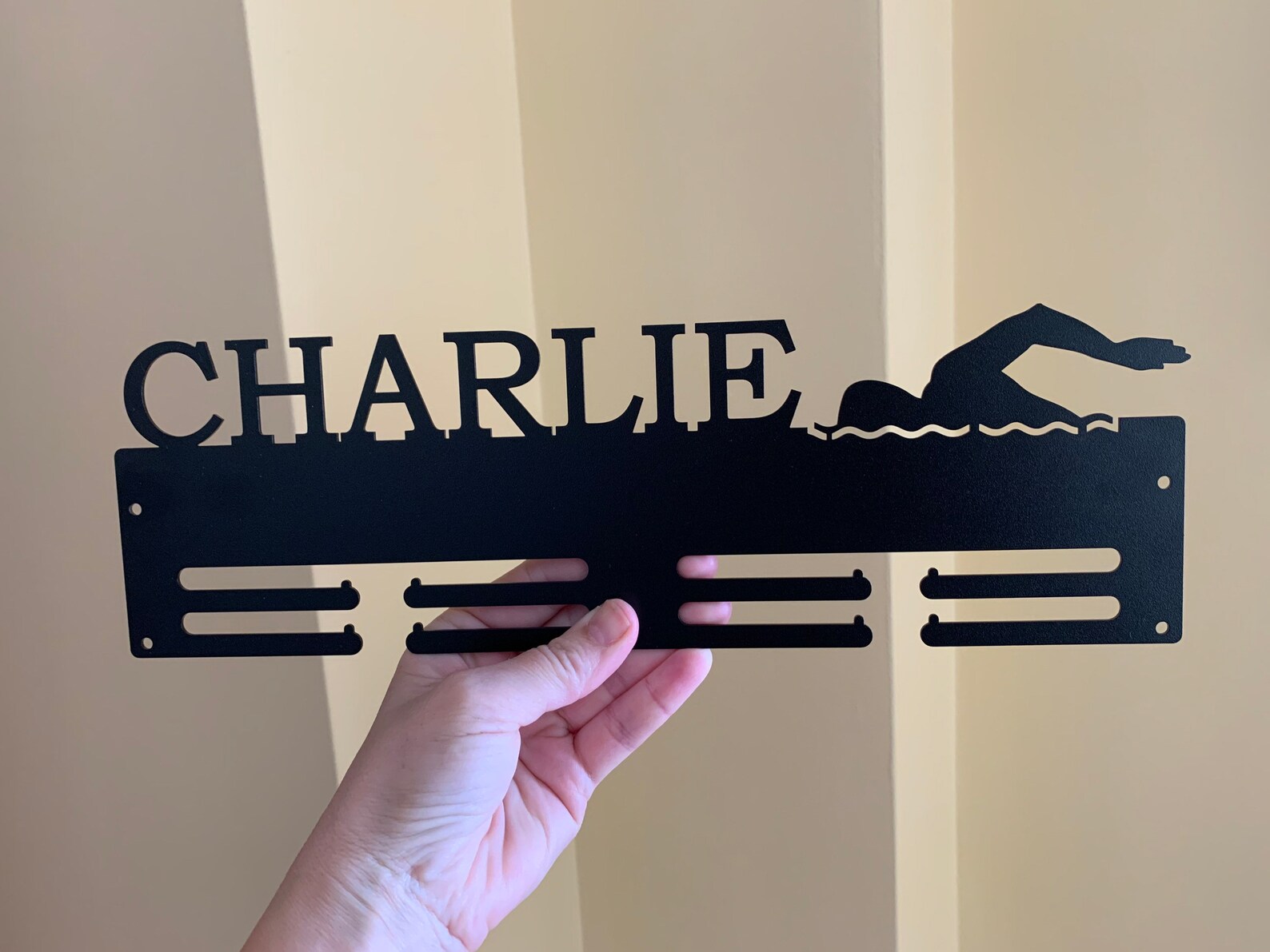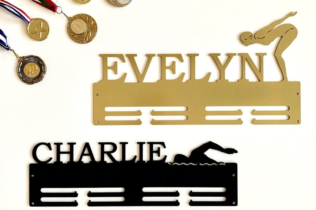 This personalized swimming medal holder with a custom name is the best way to display all that you have been collecting from the championship circuit.