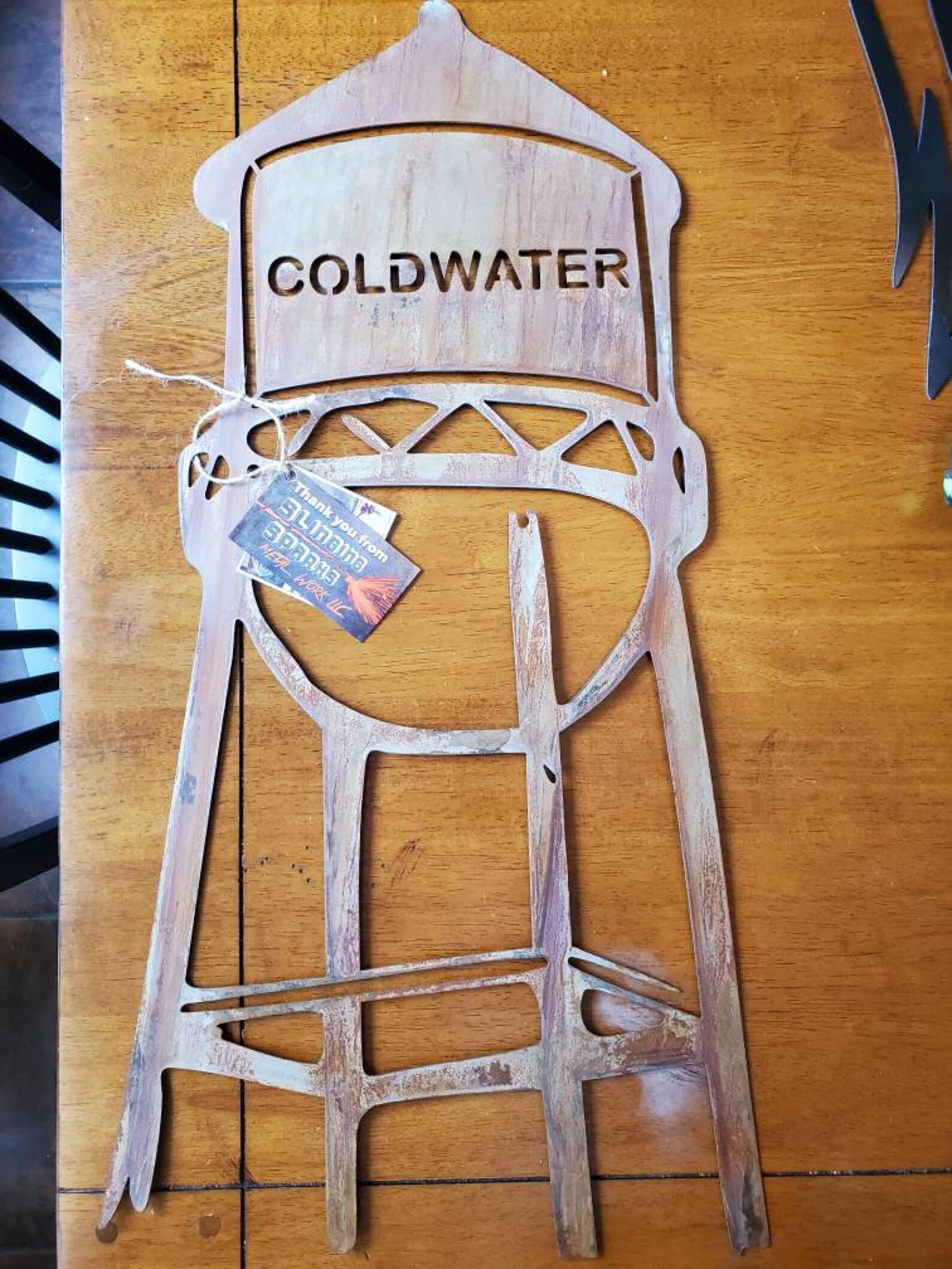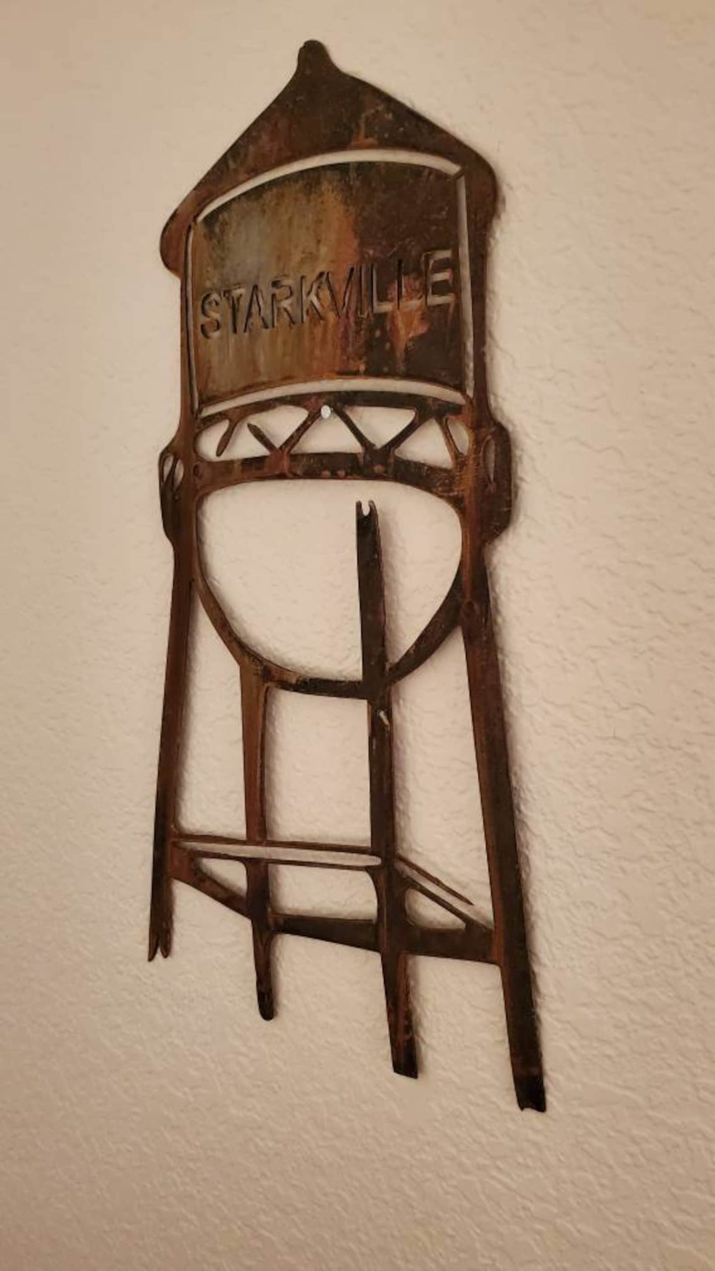 The water tower is 26 1/2 tall 13 1/4 wide. It is made out of 16-gauge metal and is powder coated.