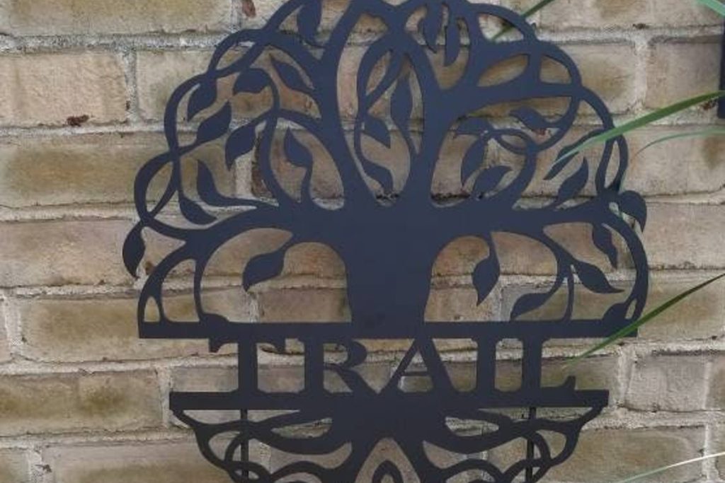 BEST SELLER!! Our personalized tree of life sign measures 18" in diameter and can be ordered with or without garden stakes. When checking out, please include name, up to 10 characters. We cut all of our designs from American Made, 16 gauge sheet metal, so it isn9;t thin and flimsy, but also not too heavy to easily hang and transport.