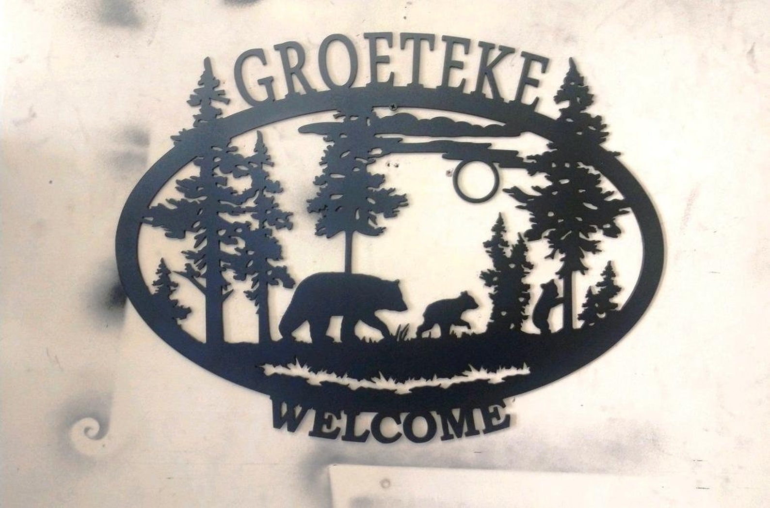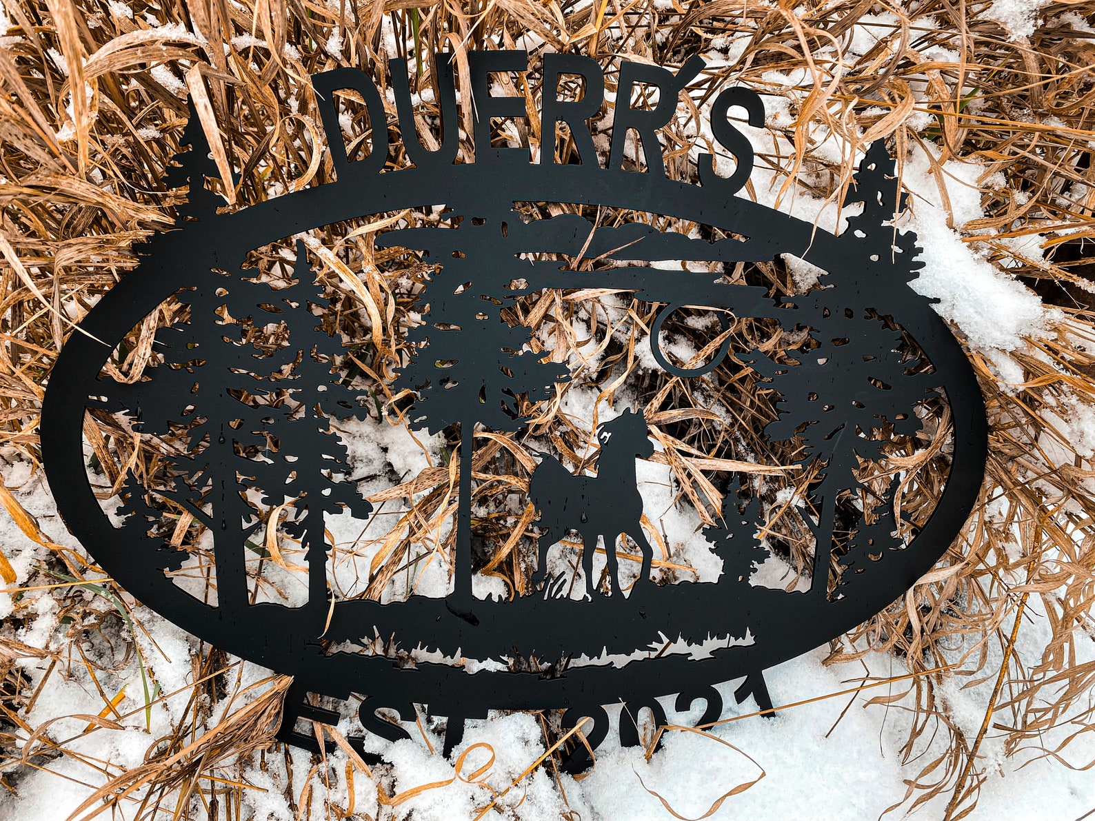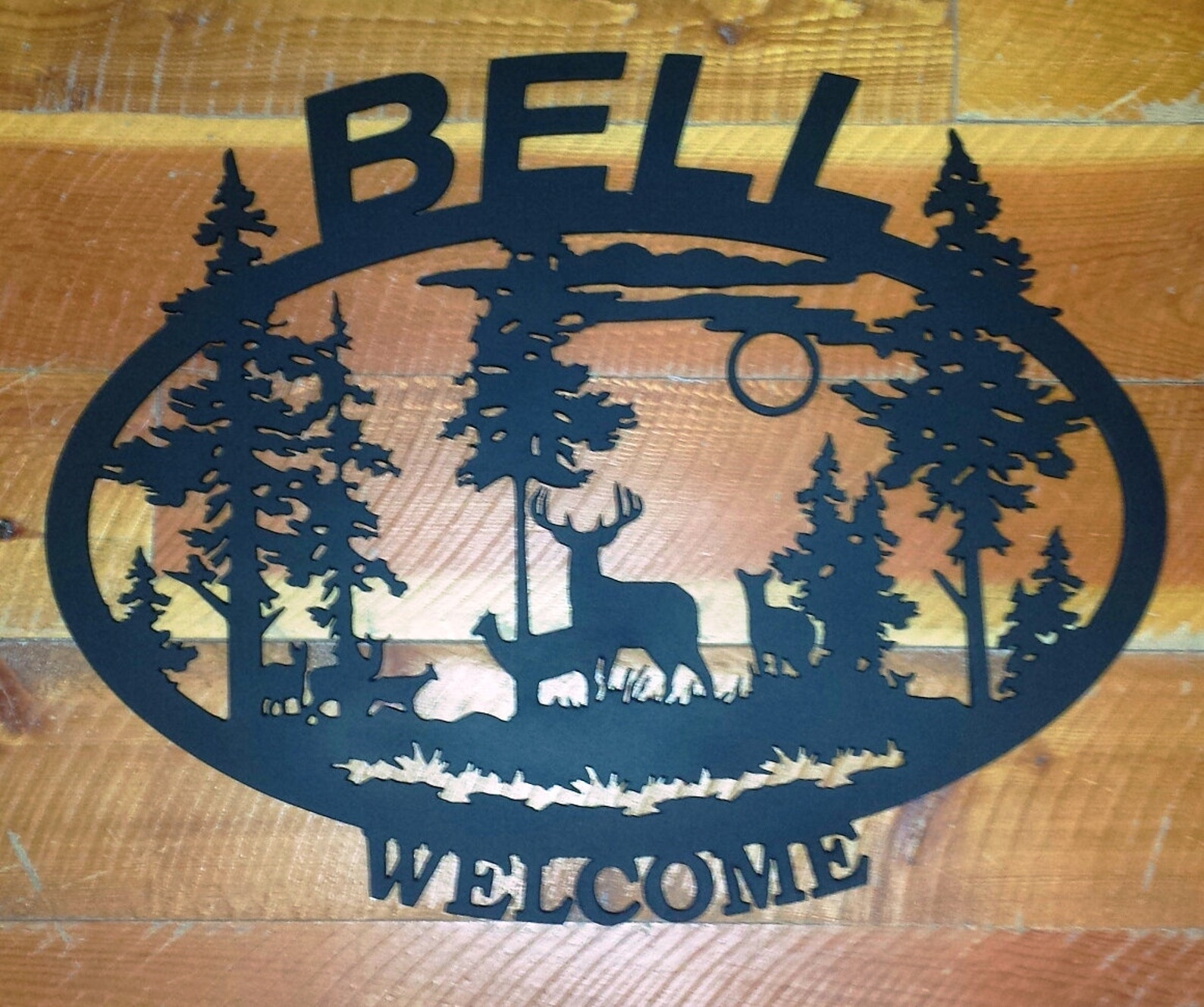 This is an oval silhouette "WELCOME" sign with detailed wildlife scene. This 16 gauge thick metal sign will have "WELCOME" at the bottom and will be personalized with your last name at the top. Your choice of four different silhouettes designed for this shape: a detailed deer, elk, horse, or bear scene. Your sign will measure approximately 21.5"W x 17"H, though keep in mind the size may vary depending on your personalization, and will have a matte black powder coat finish and can be used inside or out.
