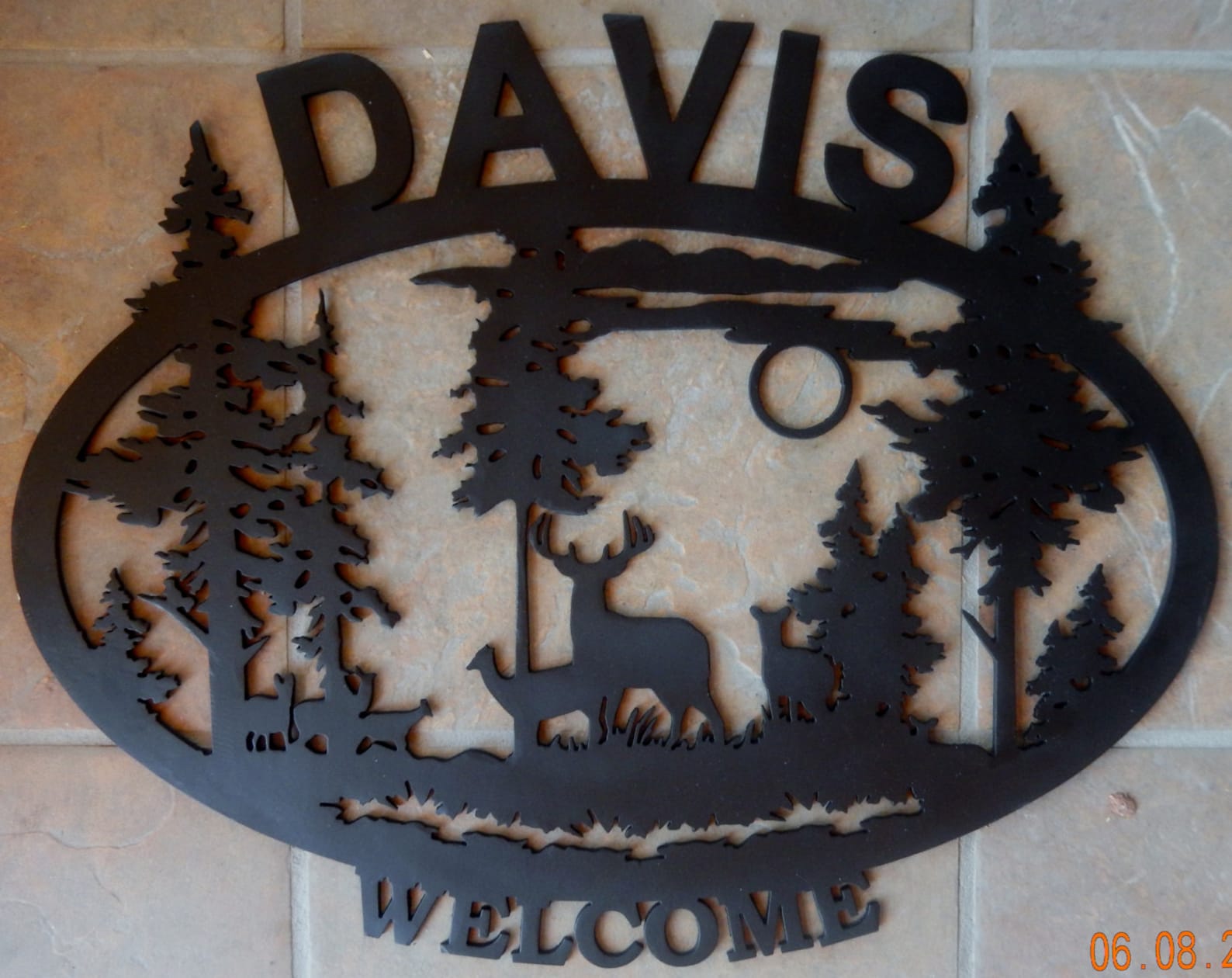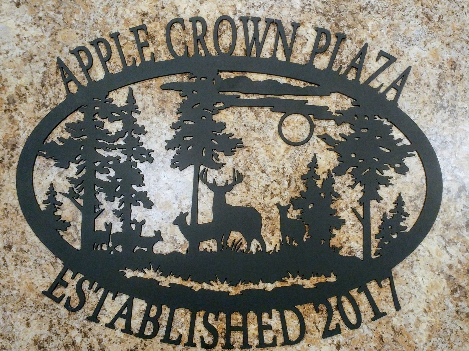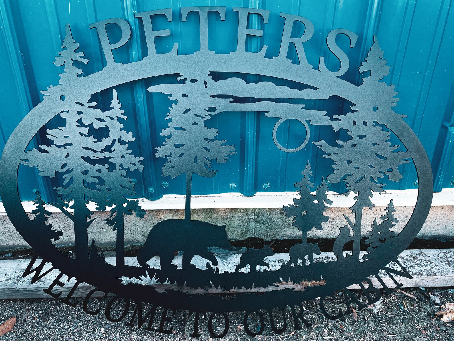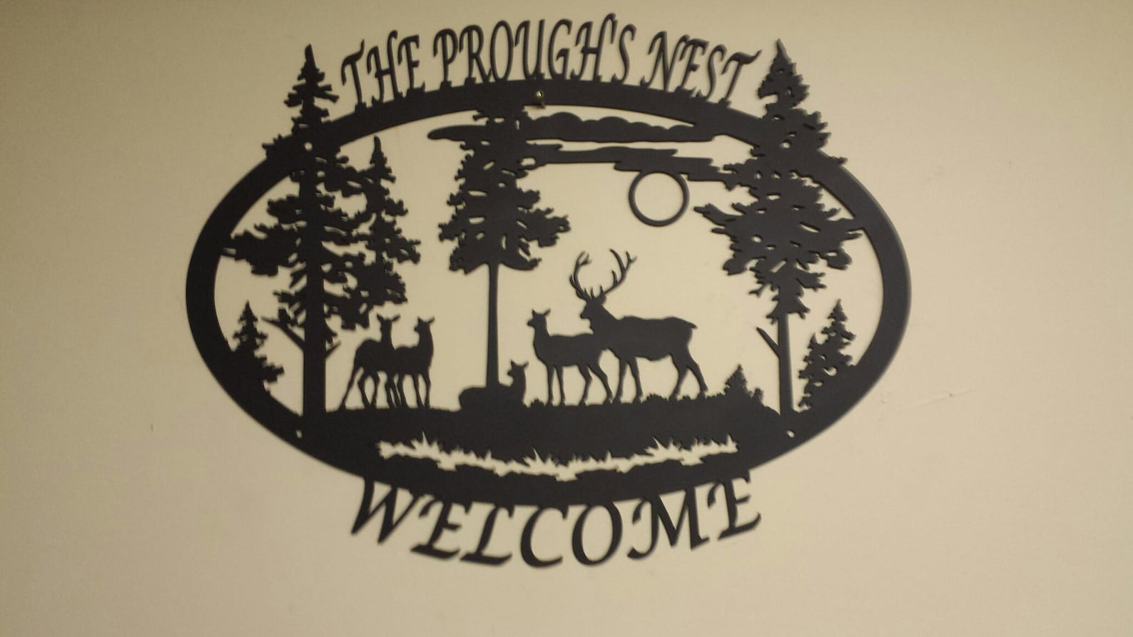 This is an oval silhouette "WELCOME" sign with detailed wildlife scene. This 16 gauge thick metal sign will have "WELCOME" at the bottom and will be personalized with your last name at the top. Your choice of four different silhouettes designed for this shape: a detailed deer, elk, horse, or bear scene. Your sign will measure approximately 21.5"W x 17"H, though keep in mind the size may vary depending on your personalization, and will have a matte black powder coat finish and can be used inside or out.