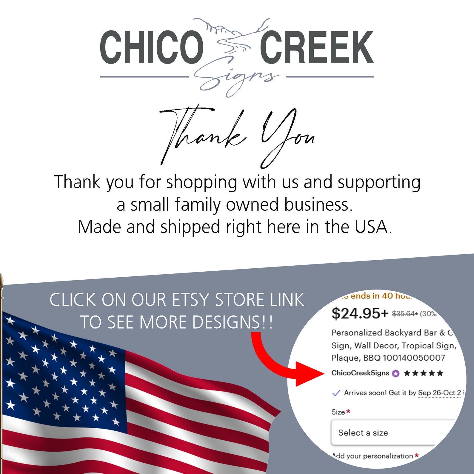 Welcome to Chico Creek Signs! Discover our wide range of Custom Wood Signs and Metal signs, perfect for every room in your home. From your Living Room to your Home Bar, Garage to the Kitchen, Man Cave to your She Shed, we have a custom sign for whatever room you9;re looking for. Whether you9;re looking for personalized gifts, holiday and seasonal decorations, or all-original customized art, we have you covered for any occasion. From Father9;s Day and Mother9;s Day to Christmas gifts, we9;ve got something for those hard-to-shop-for people in your life. And don9;t forget to explore our signs that are perfect for your outdoor living spaces too! Each sign is meticulously handcrafted with top-quality materials right here in the USA. Be sure to check out the product details in each listing for more information.