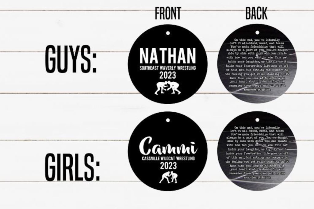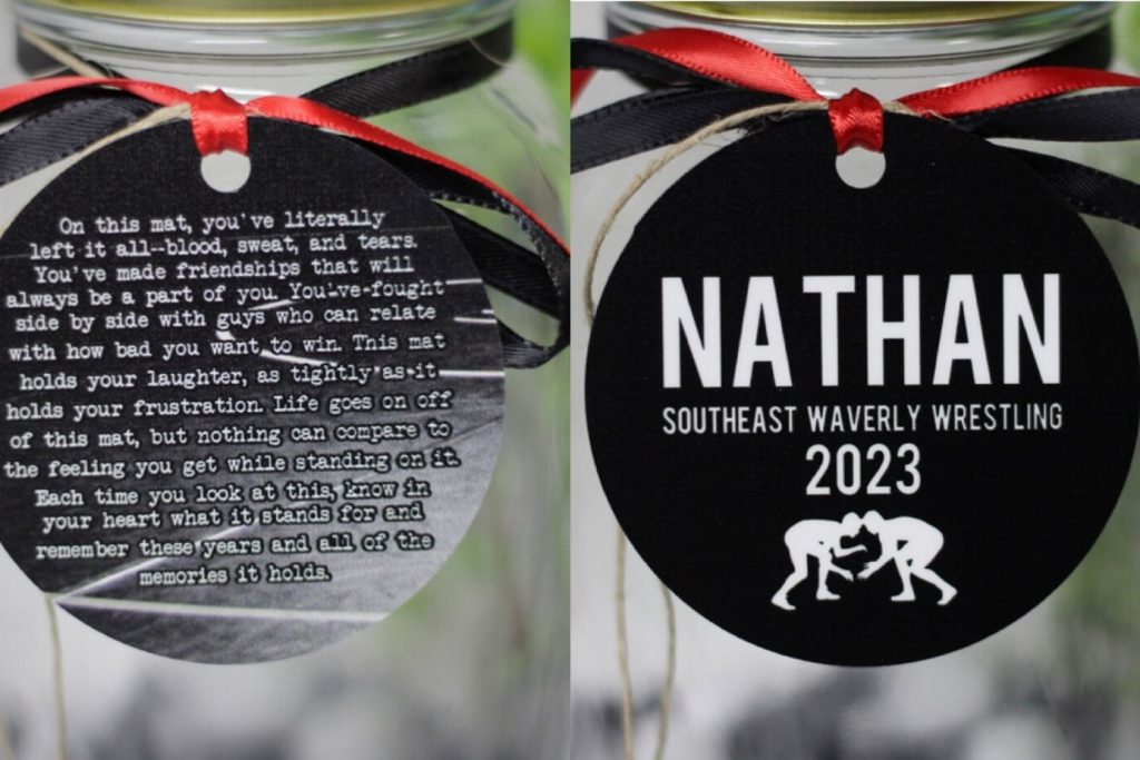 Use this personalized metal tag to attach to a jar with a piece of wrestling mat from your home team9;s gym. Makes a great sentimental gift for senior wrestlers and they9;re perfect for Senior Night at your school. Makes a great decoration for senior graduation party table decor!