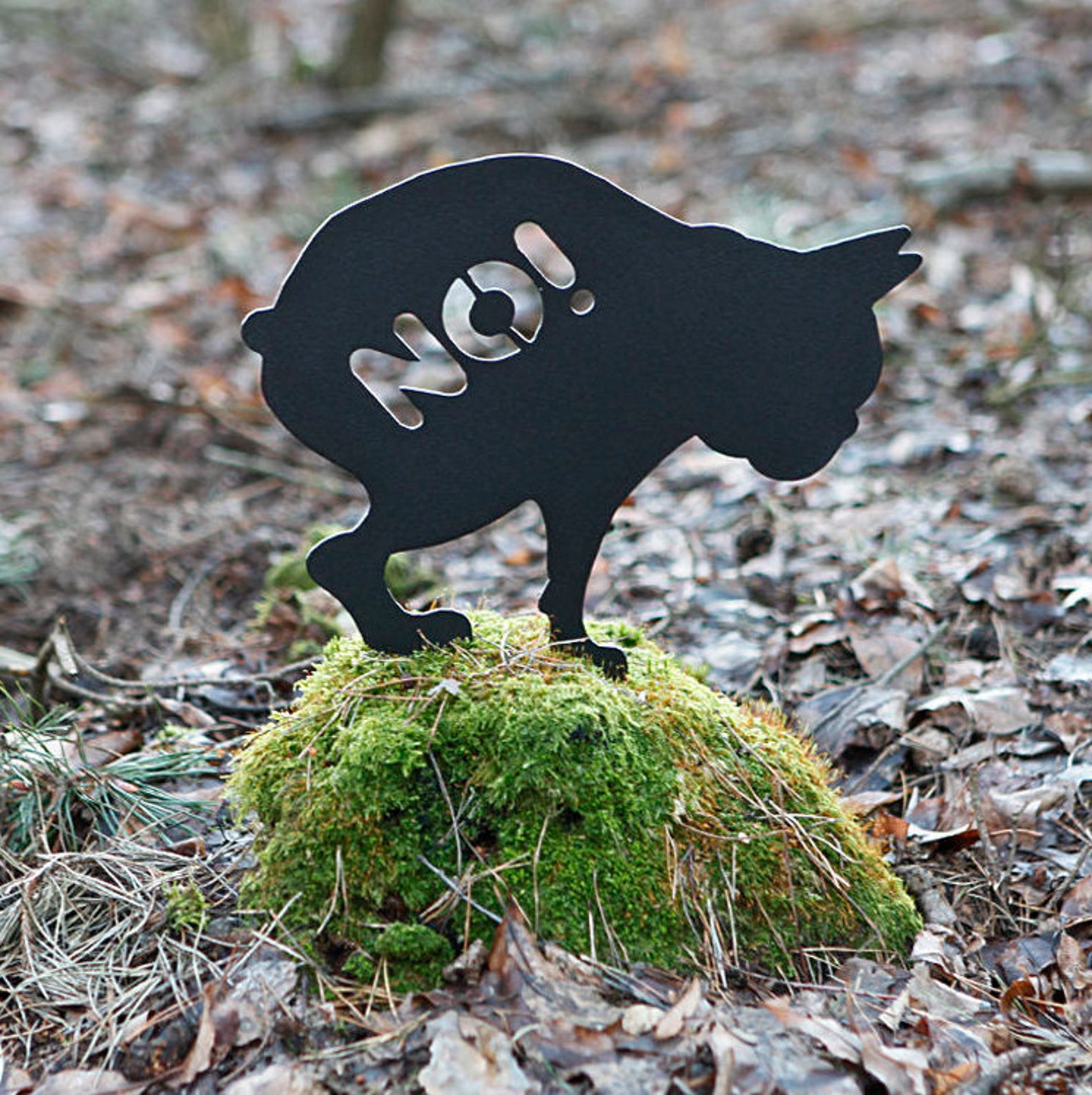 This pooping dog will not leave behind a surprise in your garden, it may scare away foreign dogs. You do not have to dig in the grass of the plaque "clean up your dog", Toto will be happy to replace them! The dog can live with you screwed to the fence or pushed into the lawn. Dog is made of 1.5 mm thick stainless steel and painted with semi-matt powder black, what guarantees longevity. Handles for insertion or screwing are provided with holes (stainless steel extension and screws incl). Toto is a small dog, resistant to weather conditions, that will beautify your garden and play a role of the scarecrow for unwanted visitors, or can also be a great gift for your friends. No poop sign.