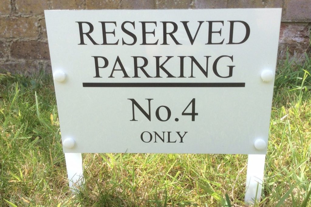 White 3mm Aluminium with black lettering with strong 5mm acrylic legs. Weatherproof and long lasting