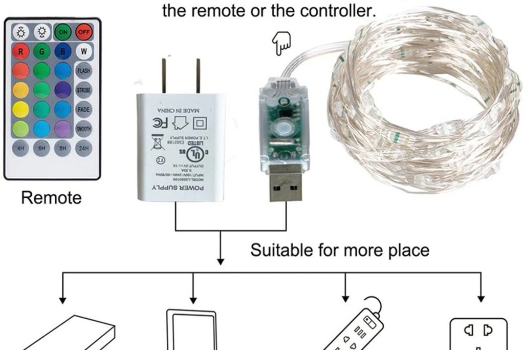 The USB plug allows you to plug the string of LEDs into a USB hub, and a power adapter, and you can go to the store and buy a CR2025 type coin cell battery.