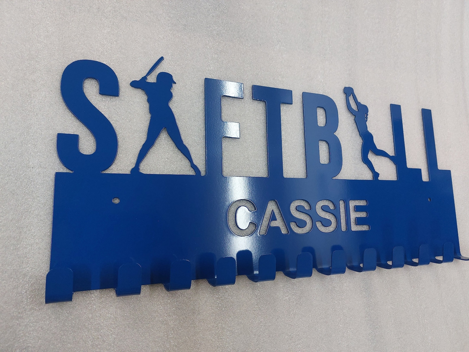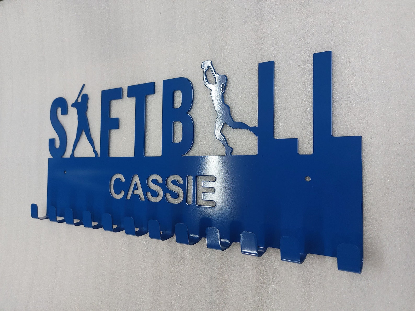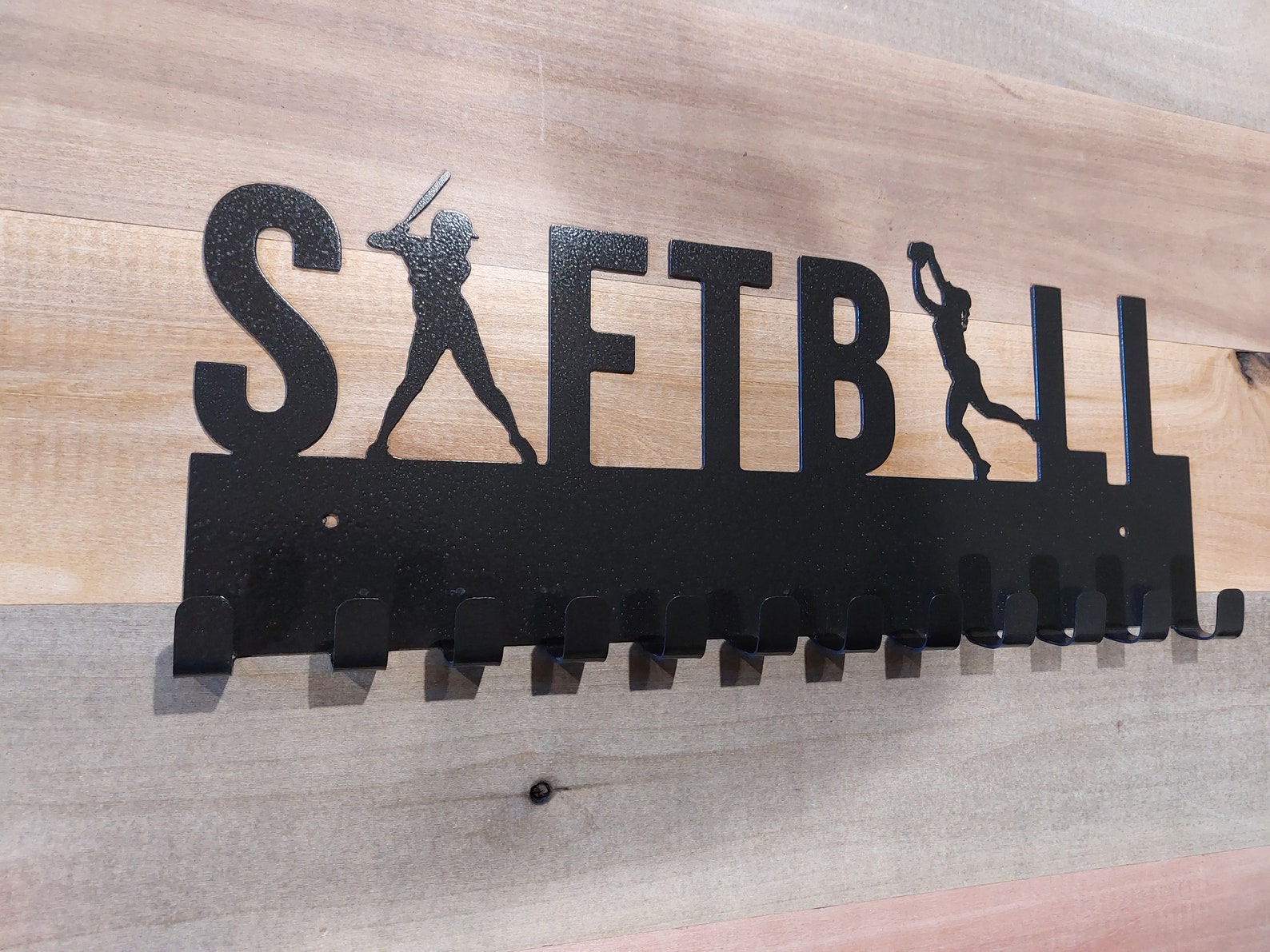 Display your favorite athletes medals with this customizable softball medal holder. It is cut from heavy duty 16-gauge steel, so it wont be weighed down with all their awards! This product comes with 12 medal hooks with 2 mounting holes 16" on center for secure mounting. Select the paint color that best matches your athlete9;s personality. If you do not see your preferred color available, message me.