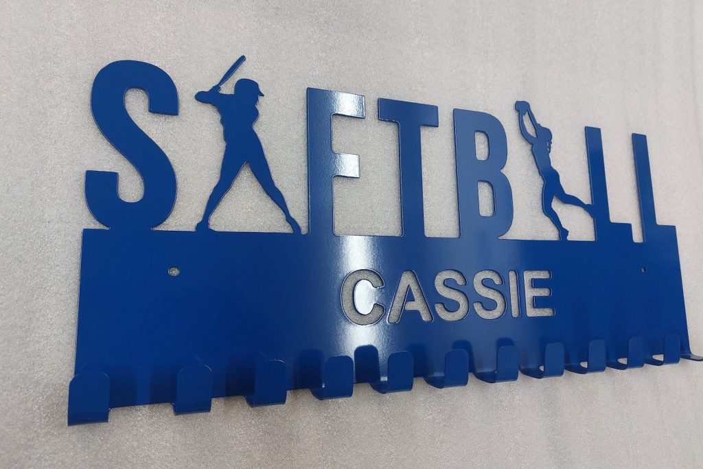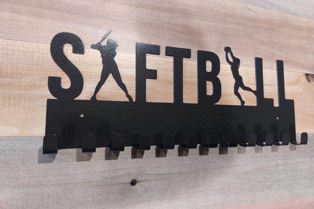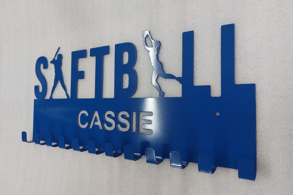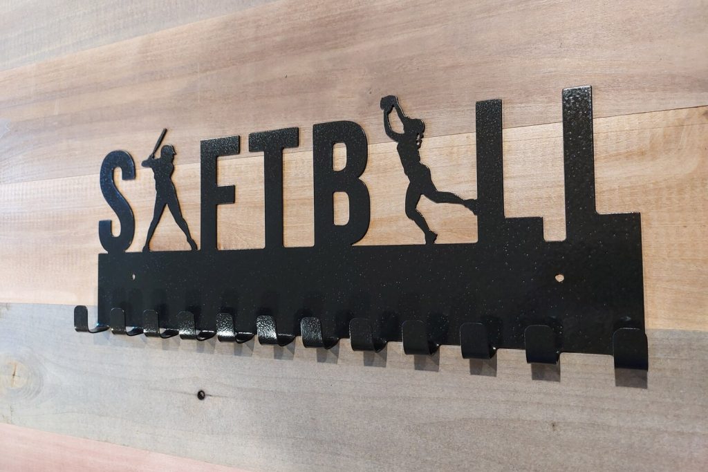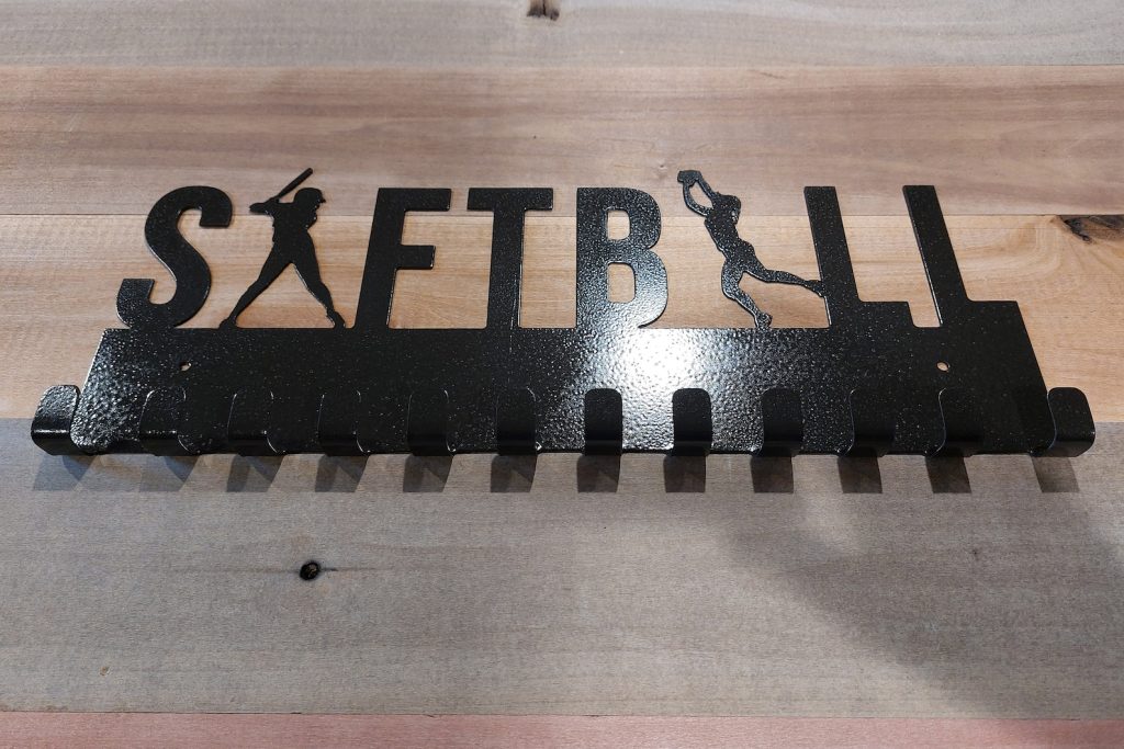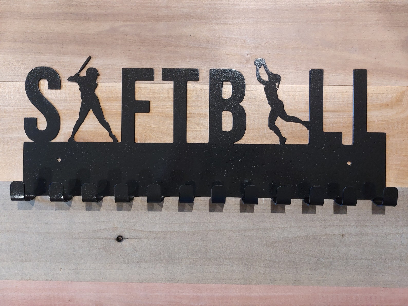Display your favorite athletes medals with this customizable softball medal holder. It is cut from heavy duty 16-gauge steel, so it wont be weighed down with all their awards! This product comes with 12 medal hooks with 2 mounting holes 16" on center for secure mounting. Select the paint color that best matches your athlete9;s personality. If you do not see your preferred color available, message me.