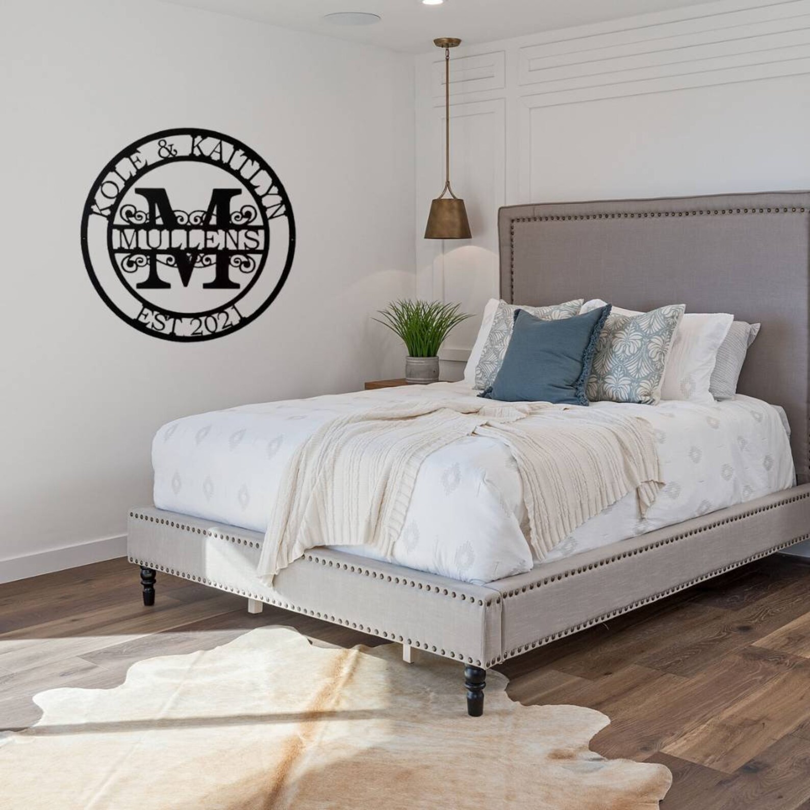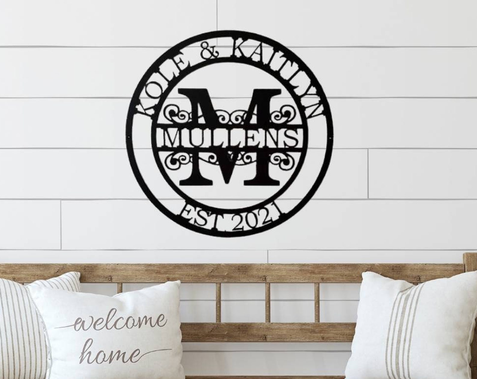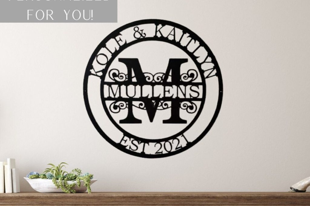 Celebrate special moments with our Custom Metal Sign, featuring an Elegant Split Letter Monogram. This Established Monogram Metal Sign is more than a decor piece; it9;s a timeless and personalized statement. Crafted with precision, this metal sign is a perfect Wedding Gift, adding a touch of sophistication to any space. Personalized with your chosen monogram, it becomes a unique and thoughtful addition to your home. Elevate your decor with this custom metal sign, marking significant milestones and creating a lasting impression. Embrace elegance and make a statement with this Personalized Sign, a perfect blend of style and sentiment for any occasion.