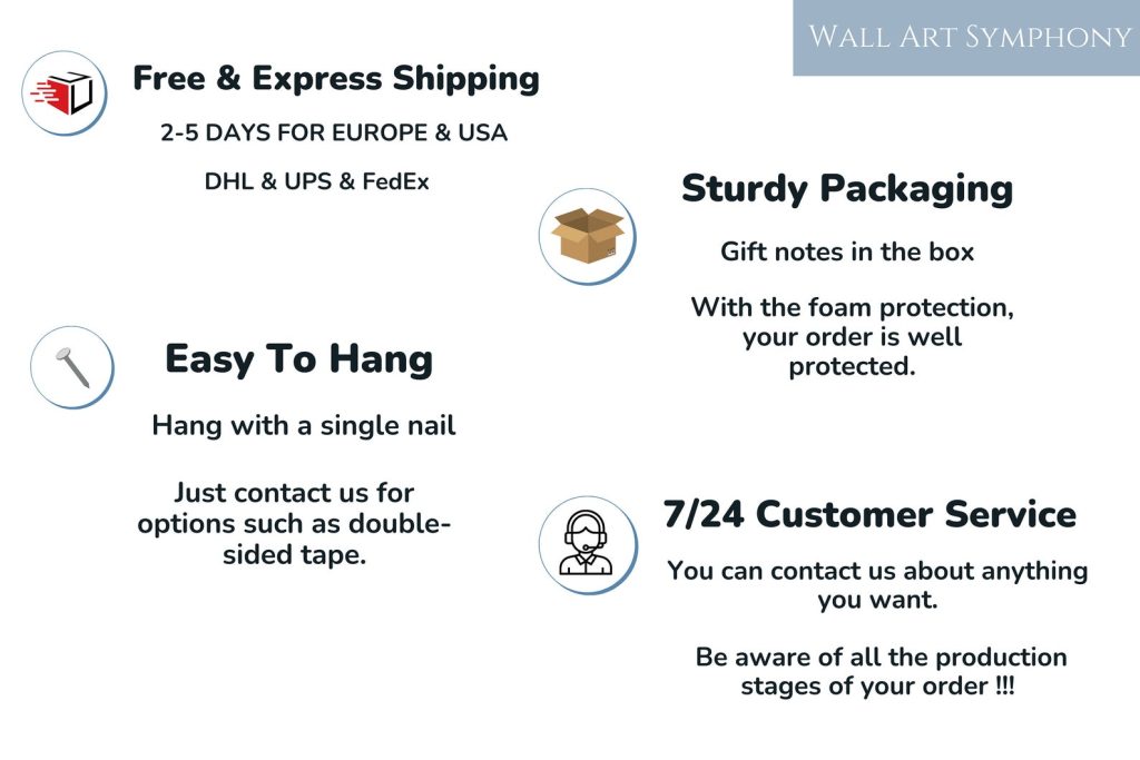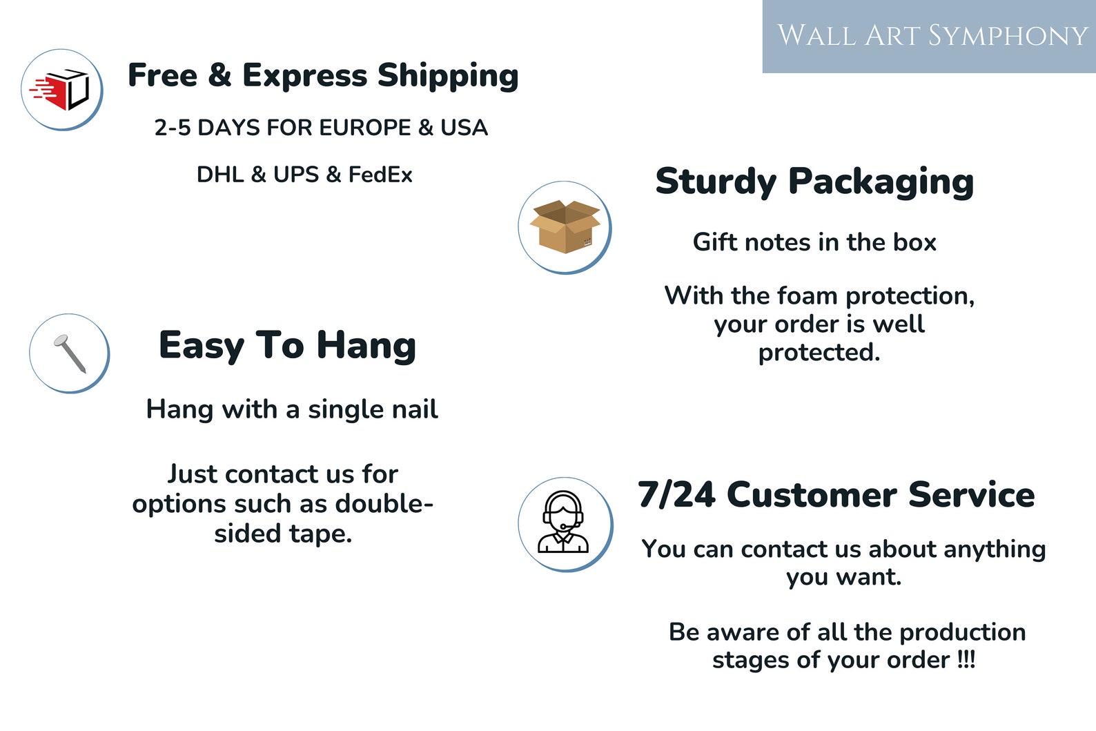Shop Policy : Our store policy is founded upon safeguarding the rights of our customers. If you encounter any issues or decide to return your purchased items, you have the right to initiate a return. At Wall Art Symphony, we have confidence in our products and hold your satisfaction in high regard.