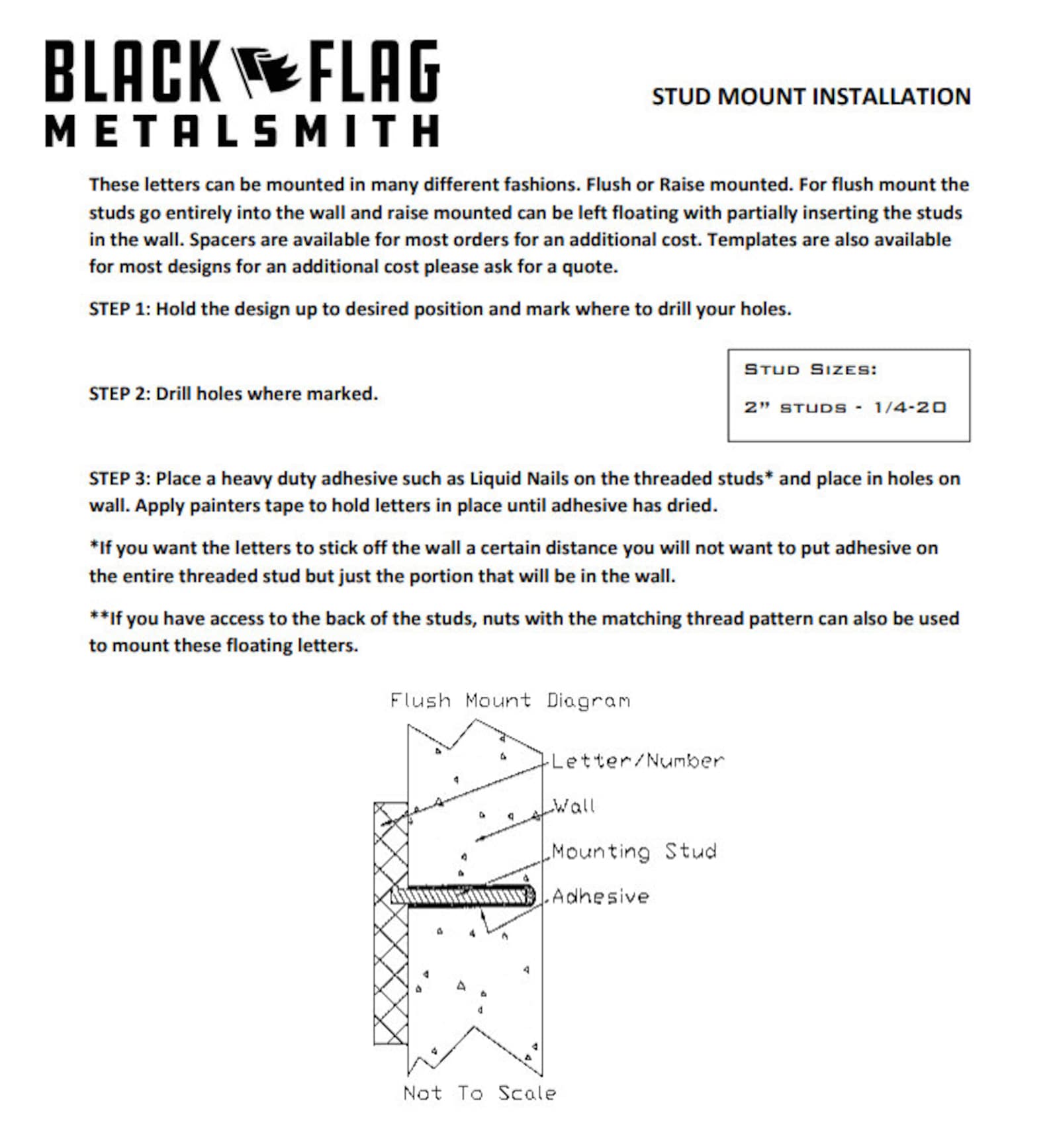 The incl studs will be 2 threaded studs welded to the back of each letter. Typically a letter will have 2 to 4 studs each. Letters with thin lines (less than thick) may not have enough surface area to weld a stud on the back. Please feel free to inquire prior to purchase. 1 spacers are also available for additional cost. Letters with spacers need lines at least 1/2" thick.