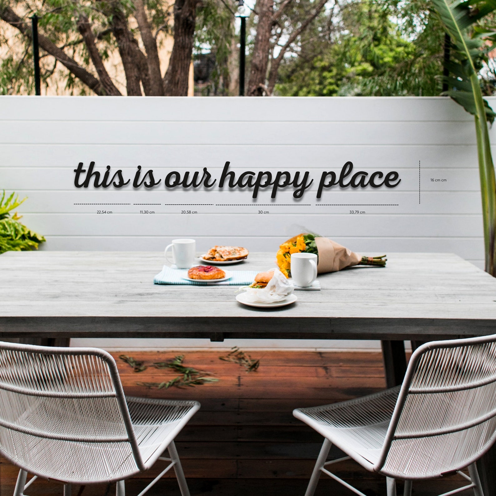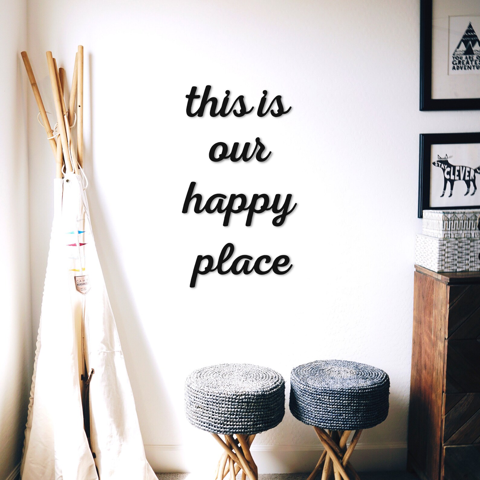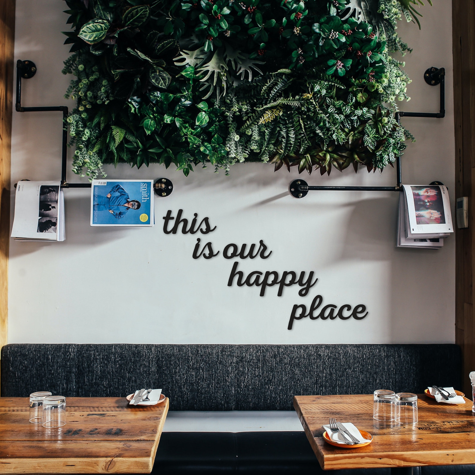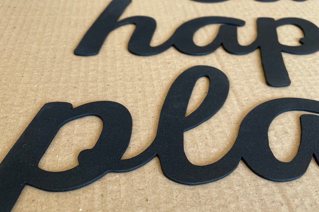 WALL DECOR FOR YOUR HAPPY LIVING ROOM – The Norn Modern "this is our happy place" word wall letters come pre-painted on black metal. Place them in your living space to add a humorous tone to the room.
