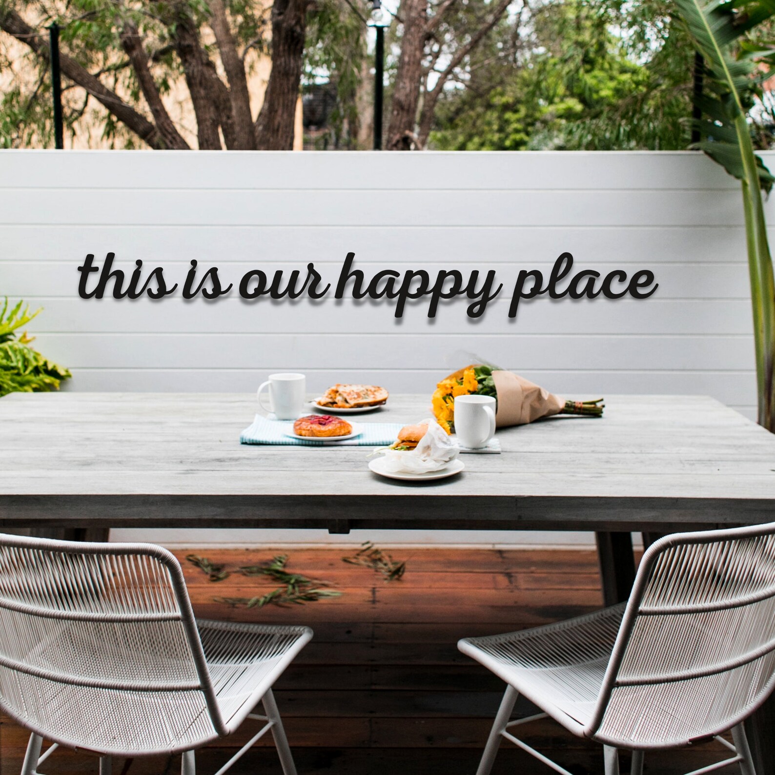 This is our happy place Sign metal , wall decor living room, black lettering , minimalist and modern wall art.