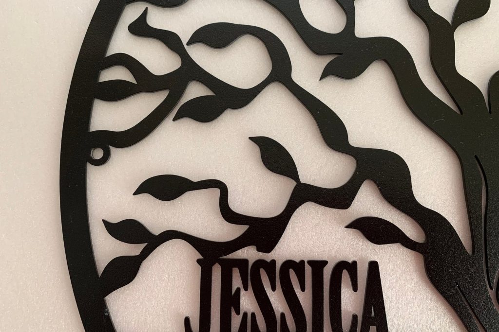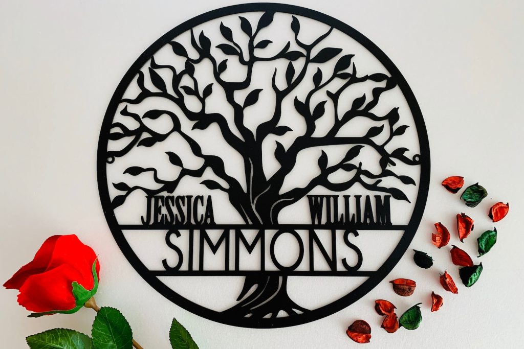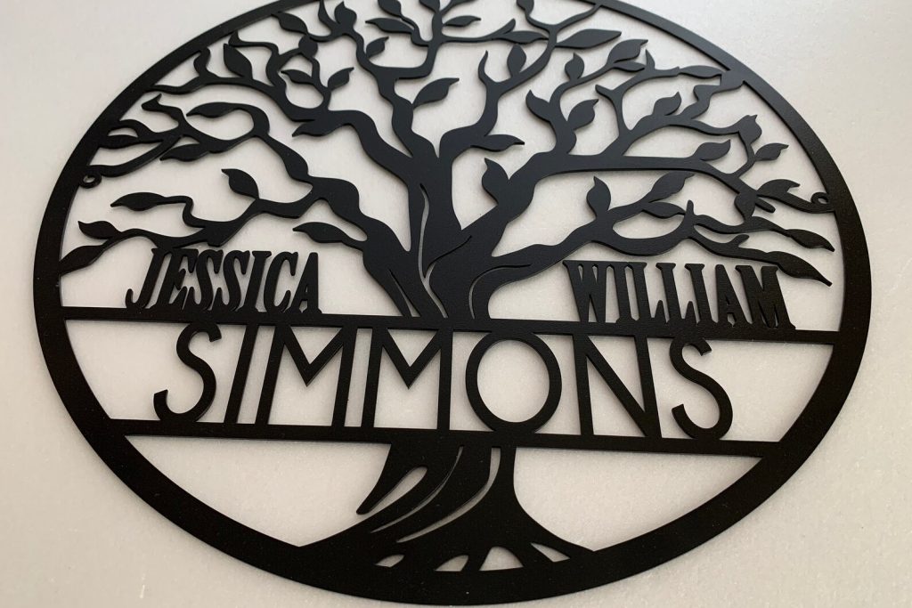 Custom last name metal sign with a couple of first names. Tree of Life sign.