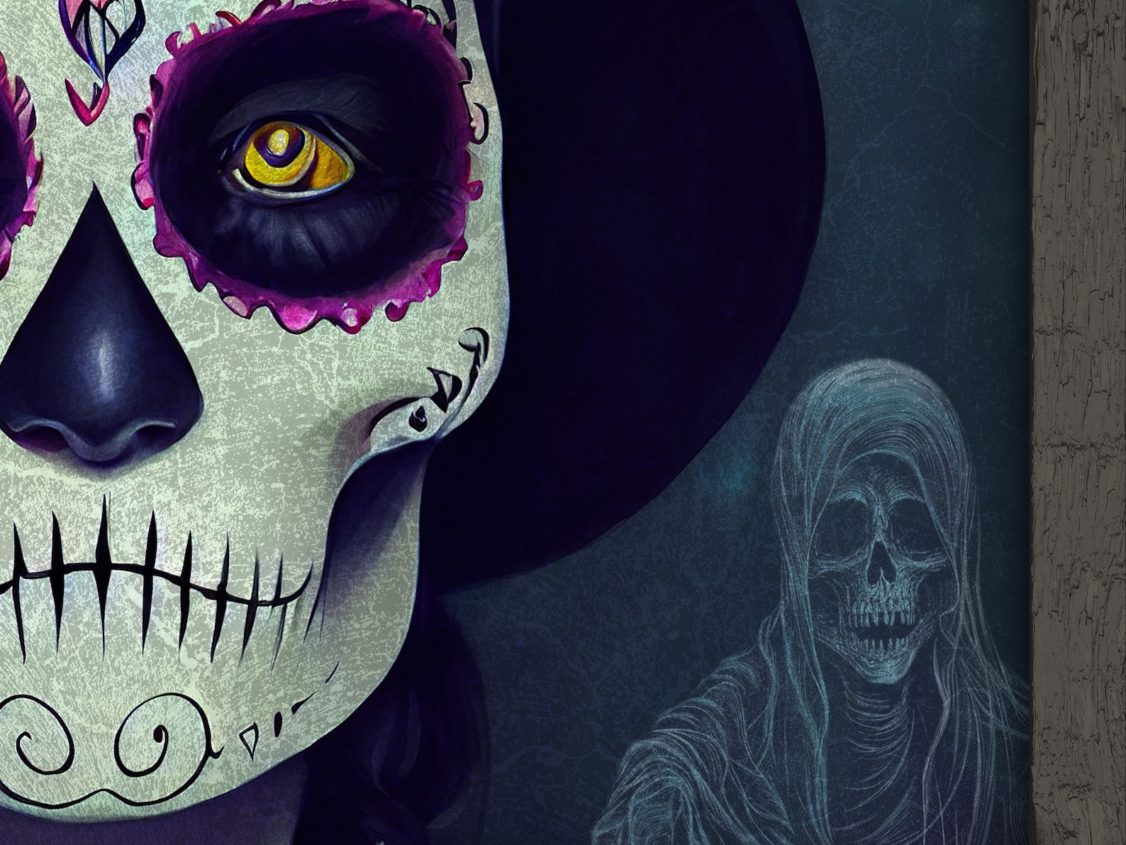 This is a vertical/portrait Halloween sign for that special wall space where a horizontal/landscape sign won9;t fit. I will customize this Creepy Sugar Skull Halloween sign by integrating your name and established date into the art you see.