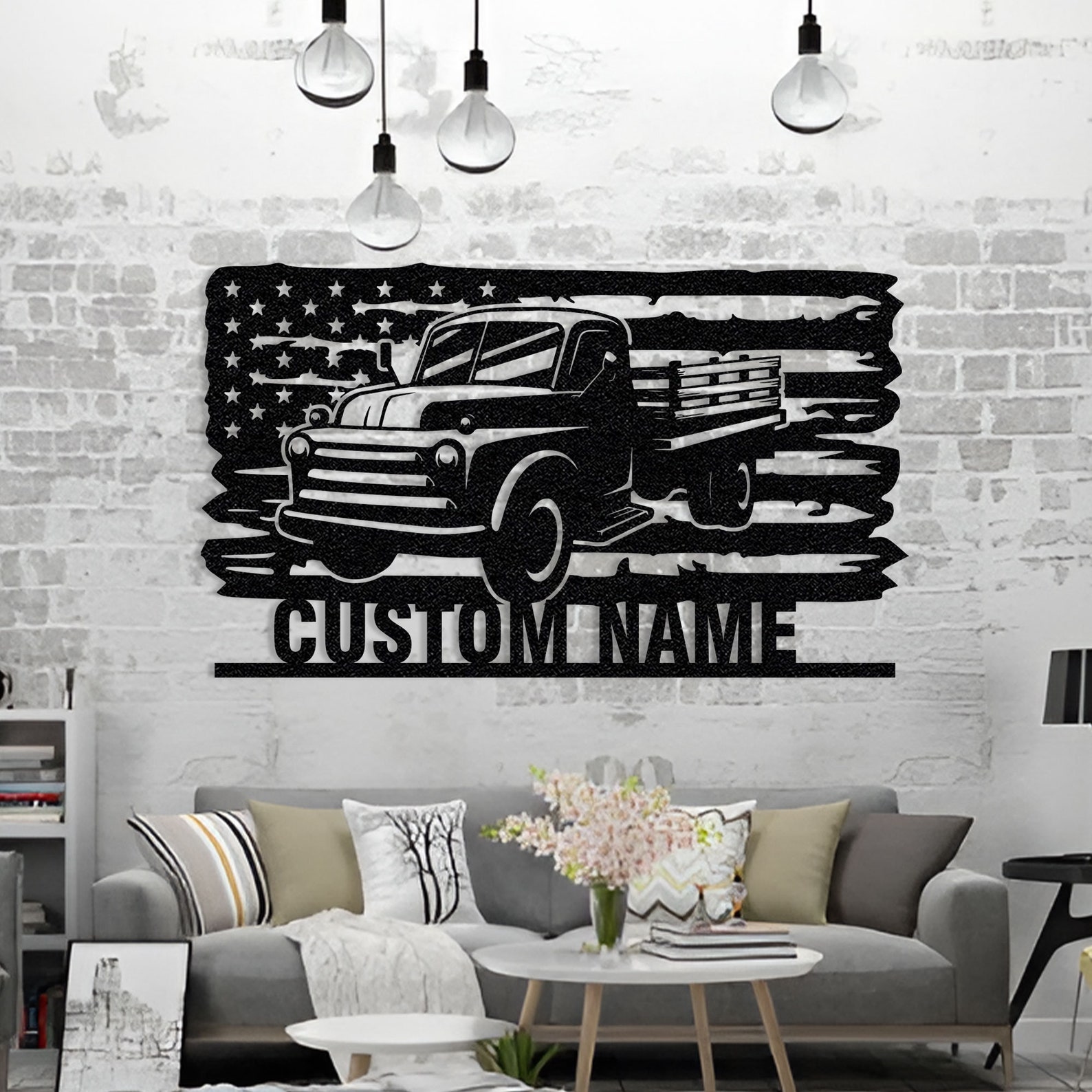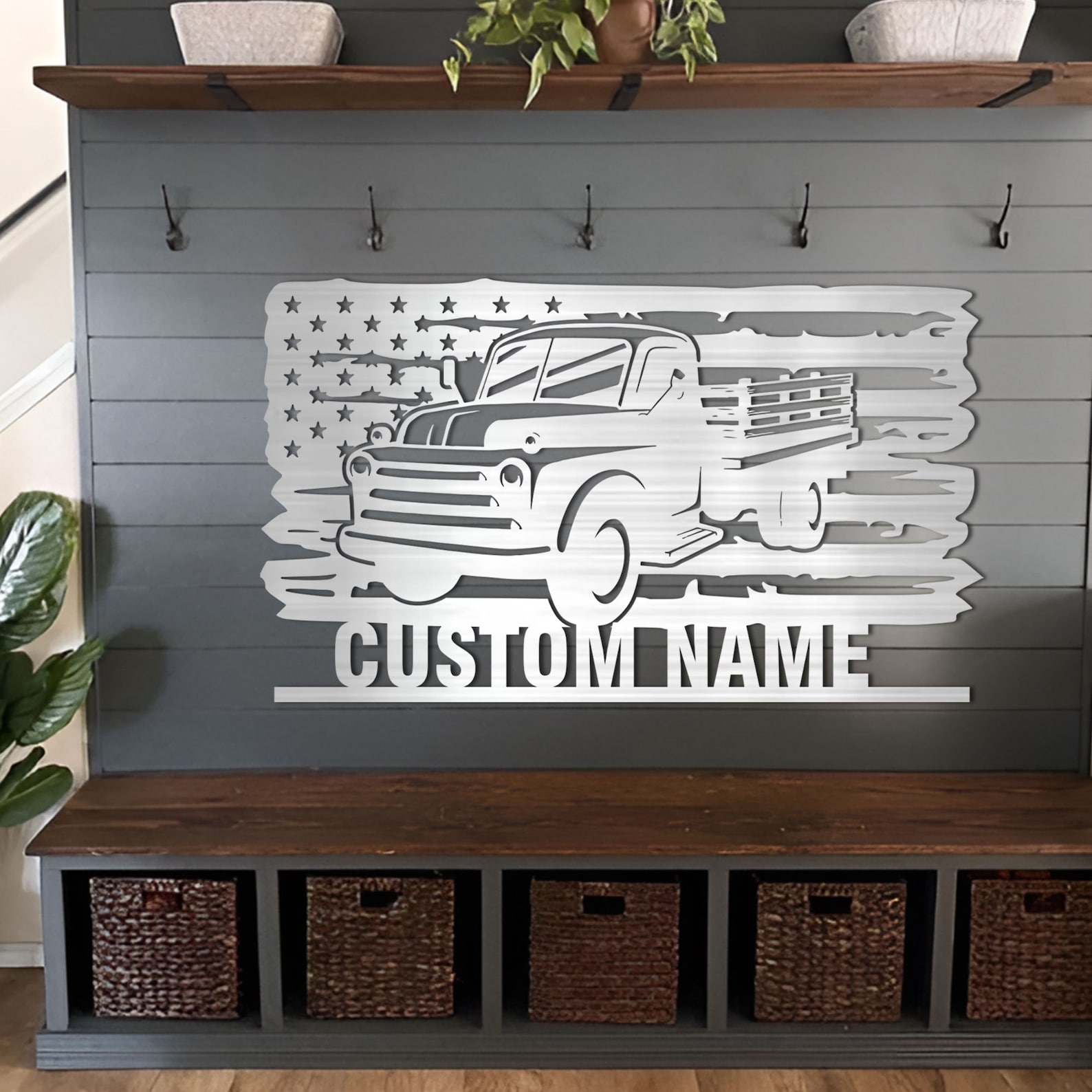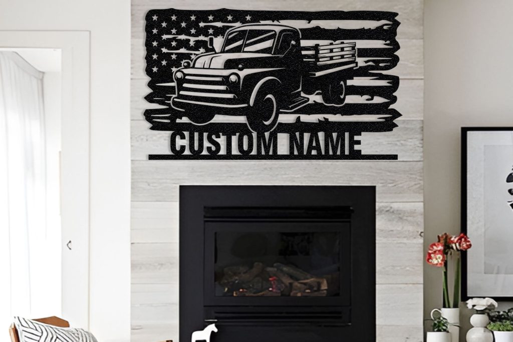 US Flags & Trucks Sign – Personal Metal Garage Decor