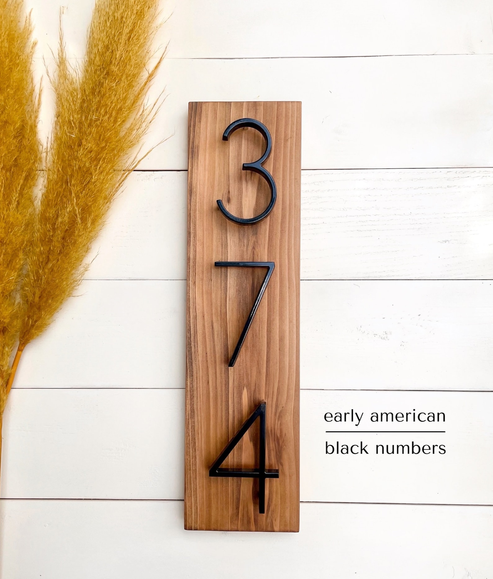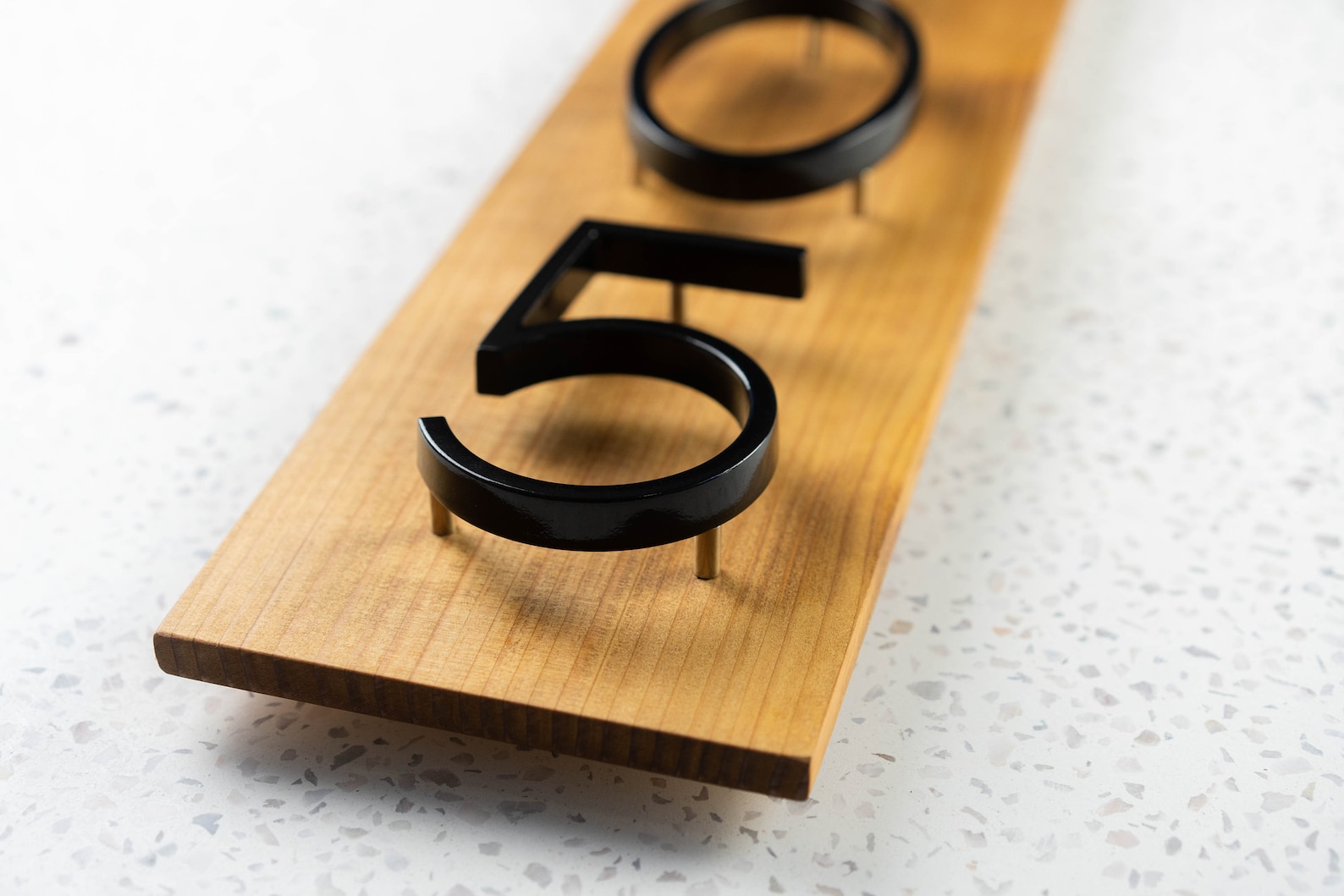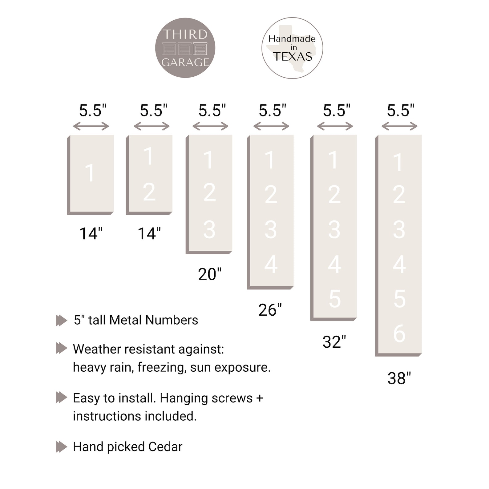 Our signs are made on CEDAR wood (durable, a natural insect repellent, moisture resistant and long lasting) with metal 5in numbers.