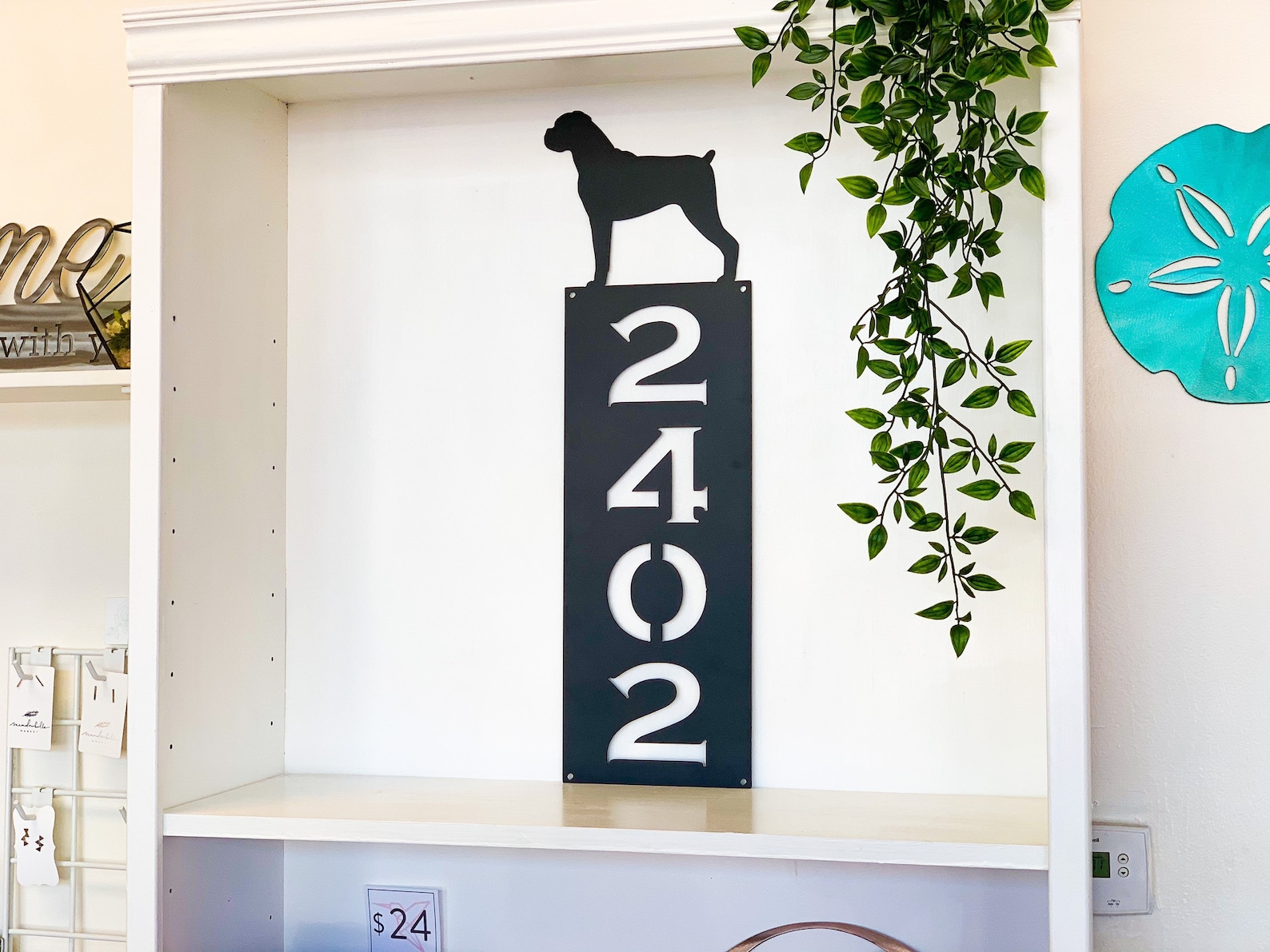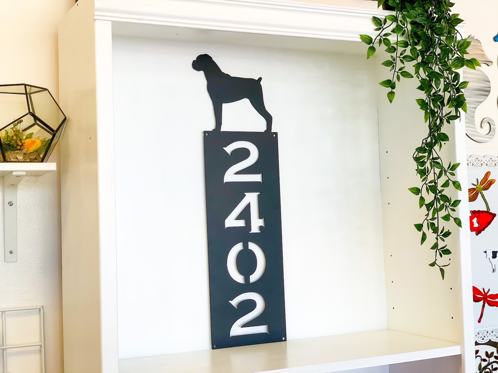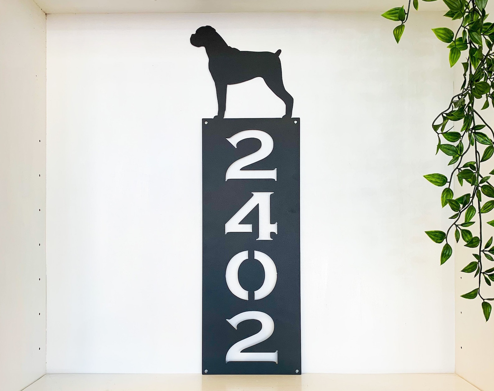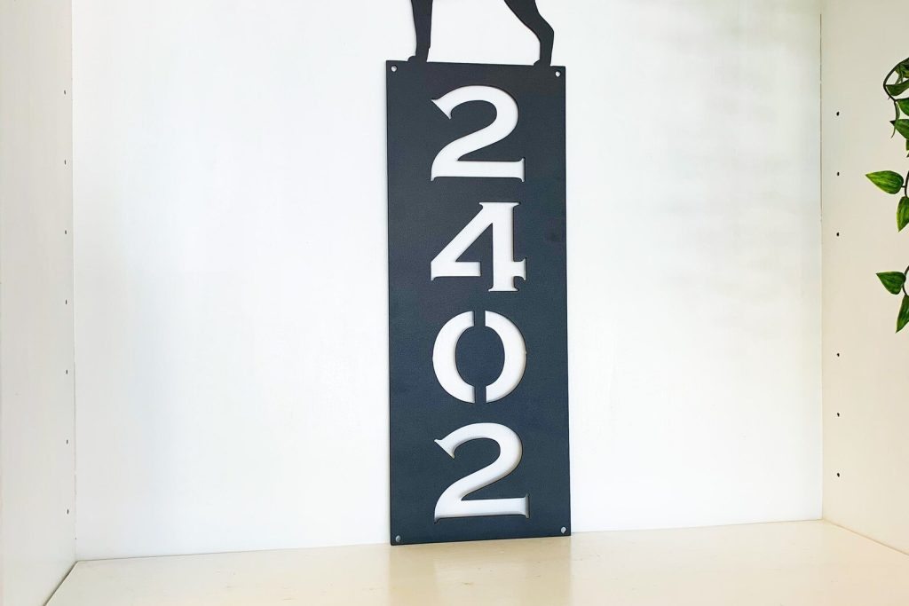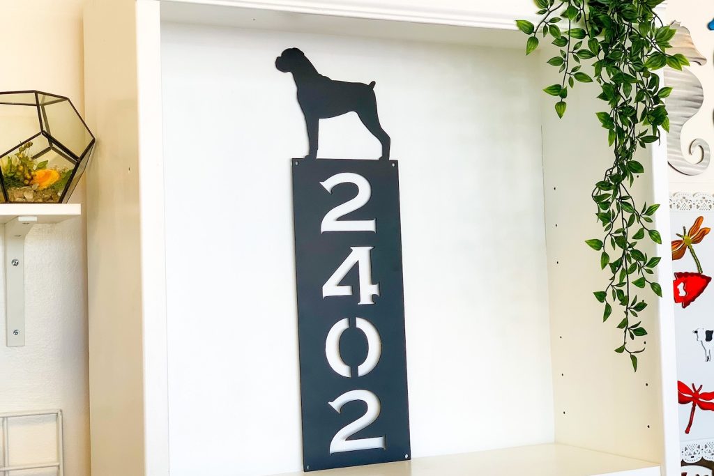 Be the first to review “Vertical Dog Silhouette Metal Address Sign – Outdoor Decor”