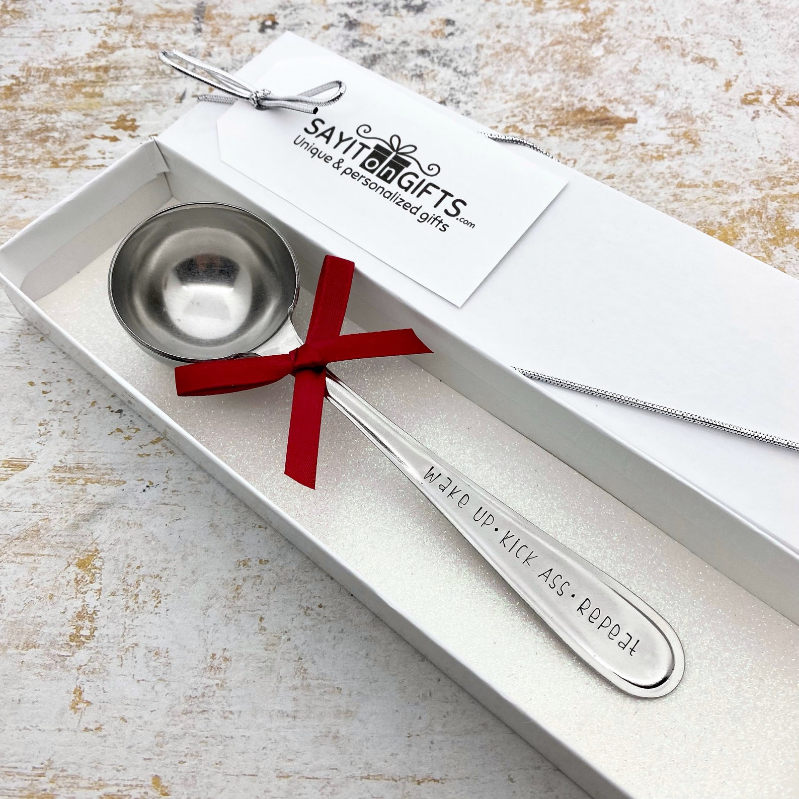 Wake up kick ass repeat scoop for coffee lovers. Unique unisex gifts. Functional gifts. Customizable hand-stamped message. Non toxic food safe finish.